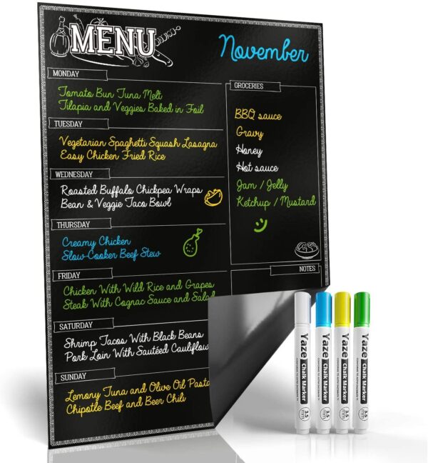 Magnetic Menu Board for Kitchen Fridge with Bright Chalk Markers – 17X12″ – Dry Erase Weekly Meal Planner and Grocery List Notepad for Refrigerator – Perfect Chalkboard Magnet Pad