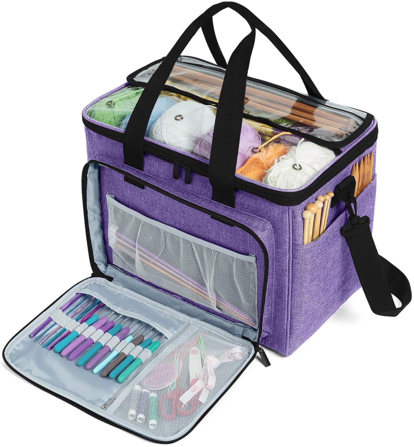 Teamoy Knitting Bag, Yarn Tote Organizer with Inner Divider (Sewn to Bottom) for Crochet Hooks, Knitting Needles(Up to 14?), Project and Supplies, Purple -No Accessories Included