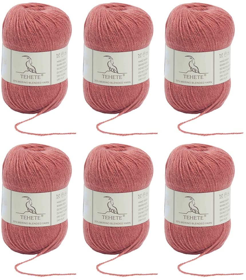 TEHETE Merino Wool 6X50g 3-Ply Soft Hand Knitting Crochet Yarn for Sweaters, Scarf, Leggings, Gloves, Socks (6 Balls, Pink)
